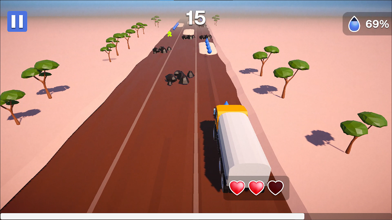 Navigate three challenging lanes of desert road to recover water droplets and fill the truck's water tank. Dodge hazardous rocks and manage your speed to ensure the community of over 130,000 residents in Hagadera receives their supply before the day ends. Developed by Odongo Games, this project supports SDG 6: Clean Water and Sanitation by turning the complex logistics of humanitarian aid into an accessible, high-impact experience.